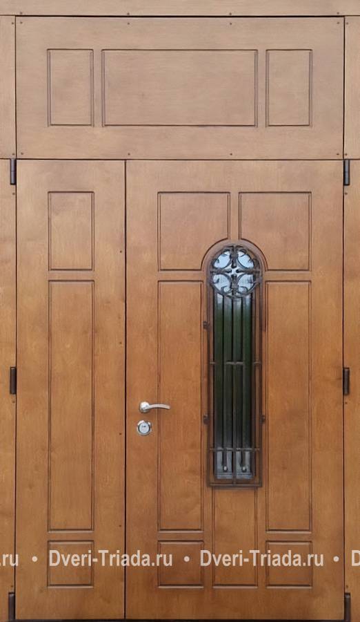 Полуторная стальная термодверь с фрамугой, ковкой и окном (плиты МДФ) Арт-498